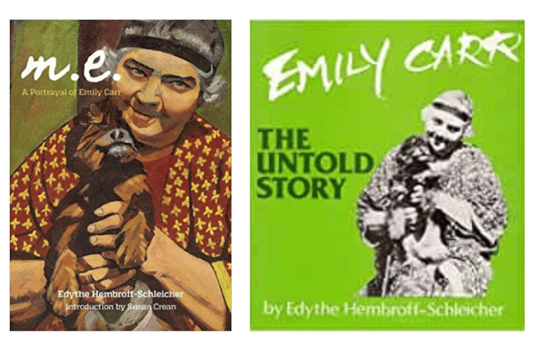 After returning to Victoria, with her second husband Julius in 1961, Hembroff-Schleicher wrote her first book on Emily, entitled “M.E: A Portrayal of Emily Carr,”, published in 1969. It was also the first biography published on Emily. Unlike other more scholarly publications that would follow by Maria Tippett’s, Emily Carr: A Biography (1979), Doris Shadbolt’s, The Art of Emily Carr (1979). Paula Blanchard’s The Life of Emily Carr (1987), and Susan Crean’s The Laughing One, A Journey to Emily Carr (2001), Hembroff’s earlier book is written in the first person, reading more like a memoir than a traditional biography — which makes it all the more engaging. Like Carr herself, Hembroff wrote the two books decades after the events she describes. The cover of her first book is one of two portraits of Carr painted by Hembroff.